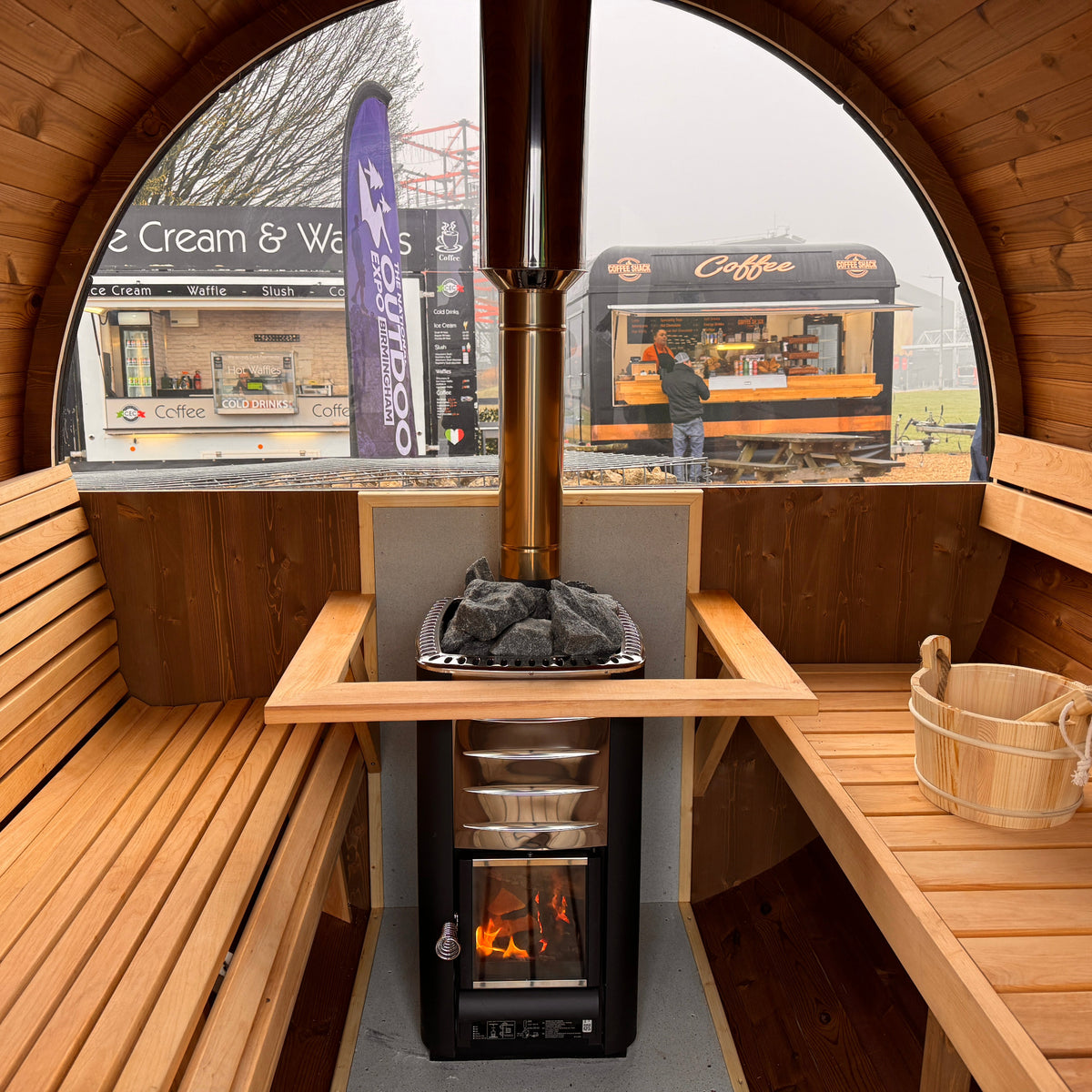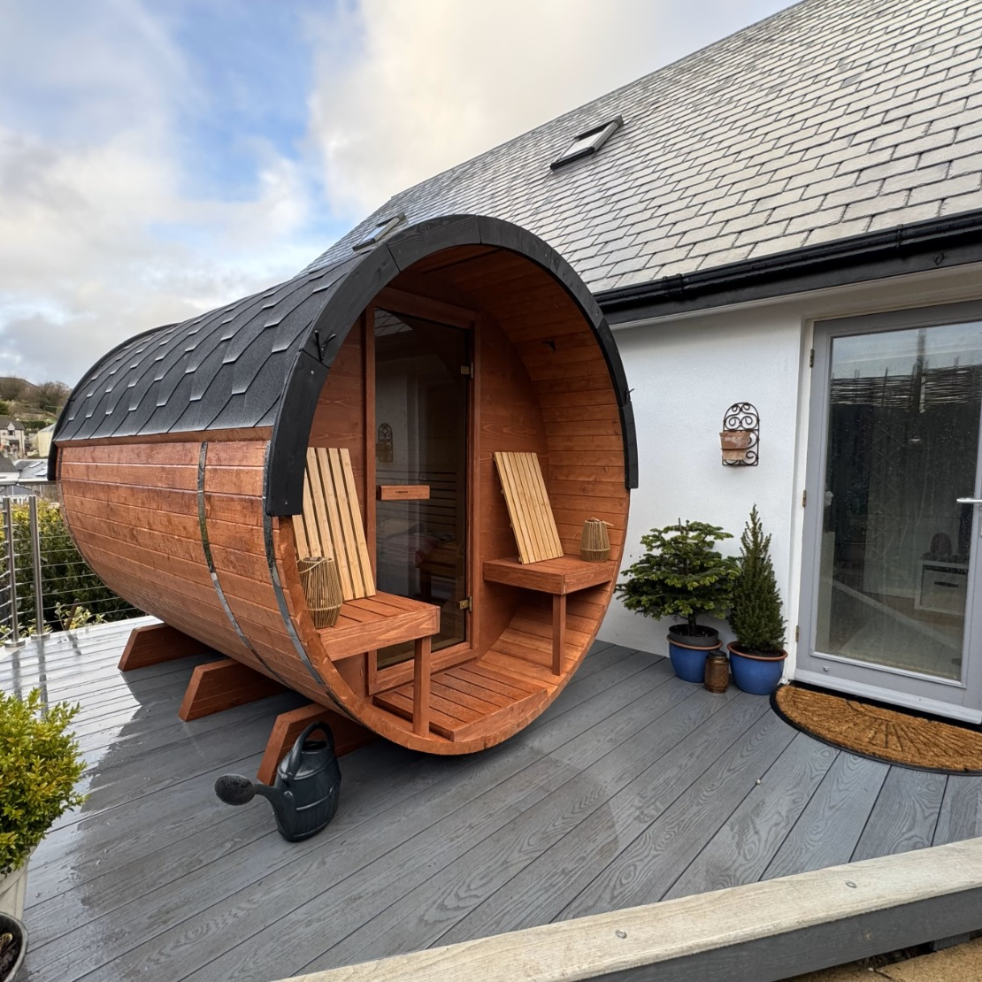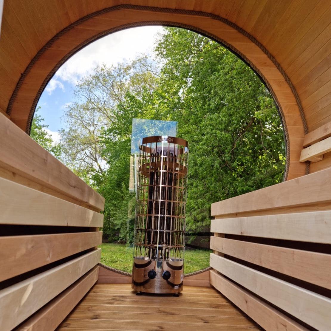 250cm Spruce Barrel Sauna | Thermowood | Terrace | Wood-Fired or Electric.
