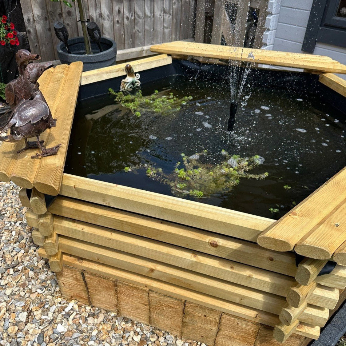 5.5ft, 100 Gallon Hexagonal Wooden Norlog Pond, 1670mm wide, 410mm high, a beautiful, tranquil addition to your garden space. Ideal for smaller spaces like your balcony or small garden. Extra height on this pond to provide a larger pond but still not taking up too much space.