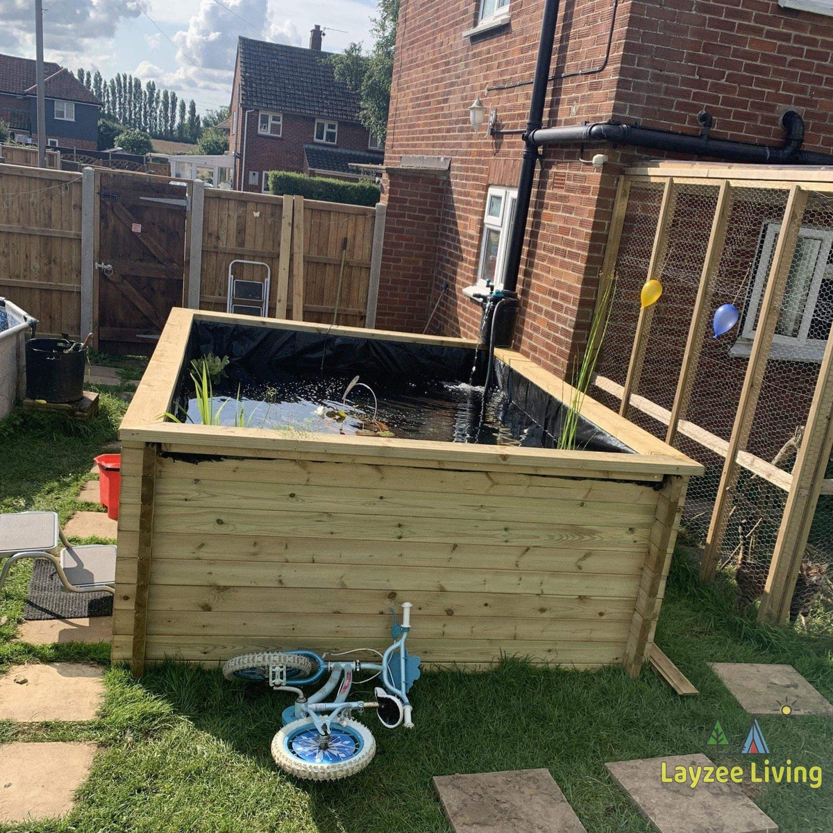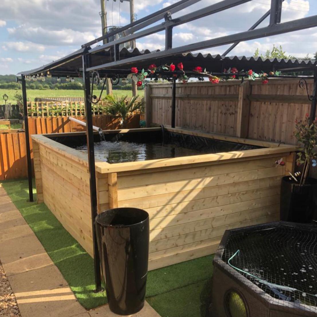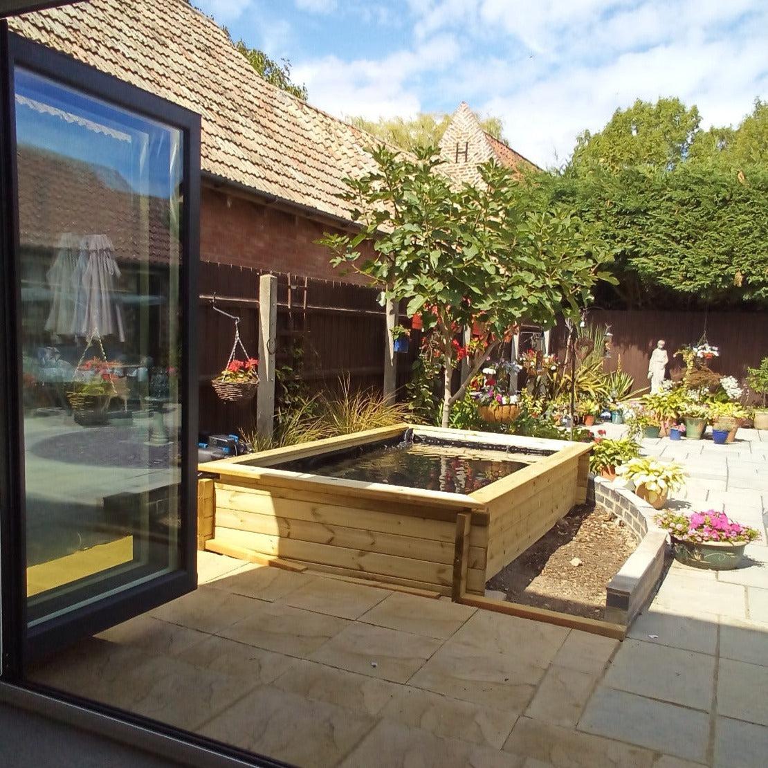 Raised, Stand-alone Wooden Koi LayzeePond ®, 70mm thick timber logs, a very strong, large capacity pond with the correct depth for keeping Koi.