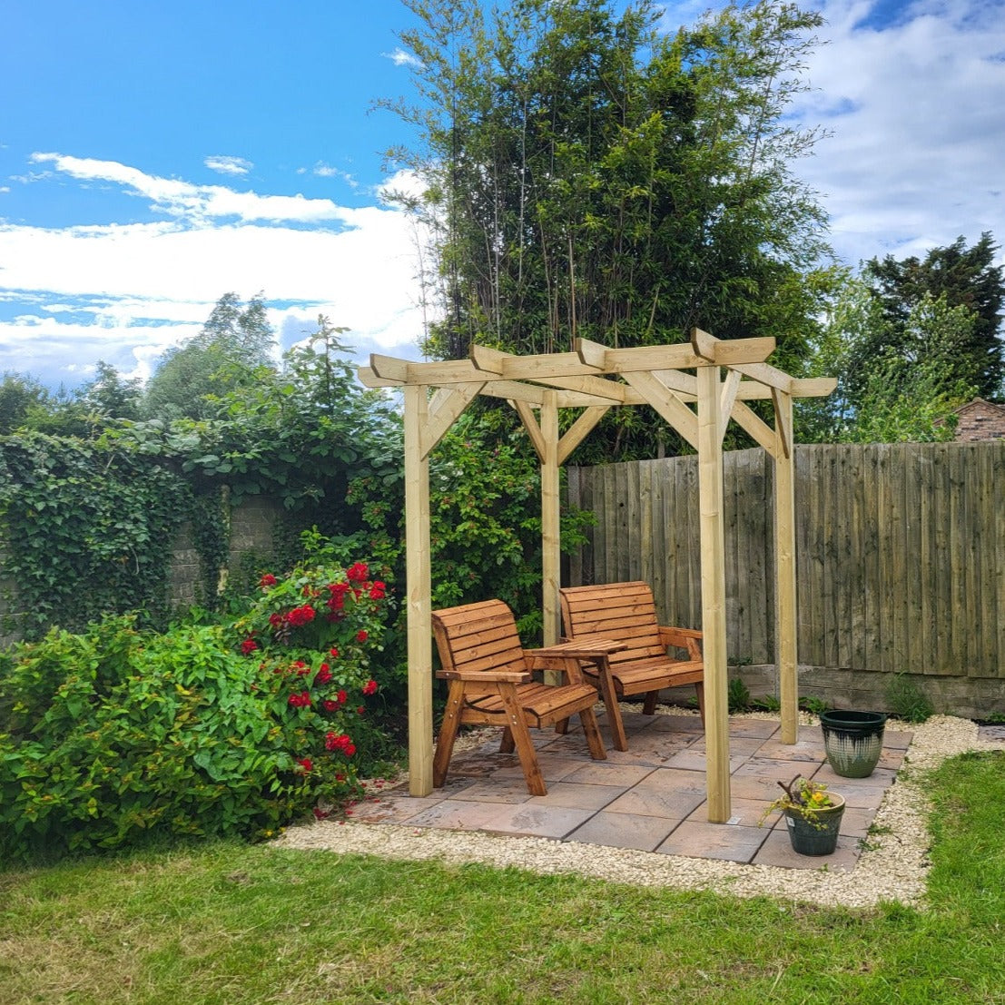 Made from tanalised, pressure treated slow grown spruce, they are built to last and come with a 10 year warranty. This pergola is very sturdy and durable.