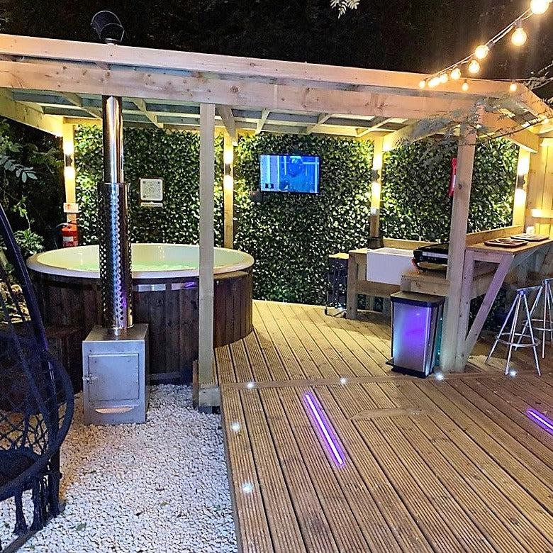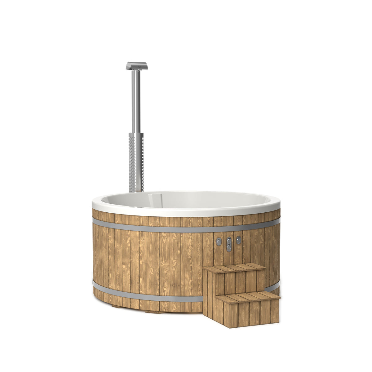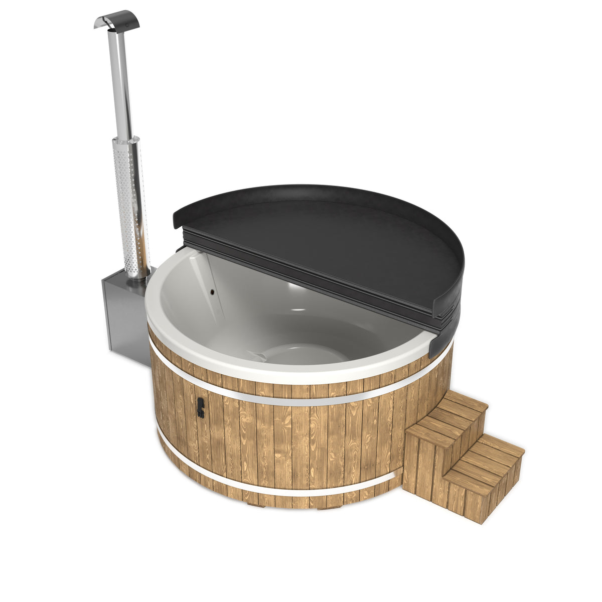 The "René" 200cm 4-8 person Scandinavian Spruce, thermowood or Composite clad, wood fired hot tub with external heater, optional spa systems and other luxurious extras.
