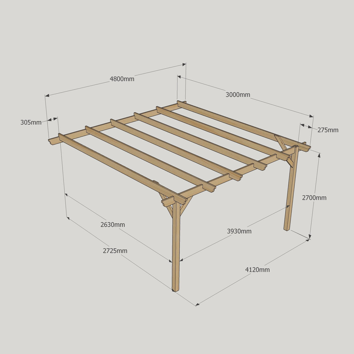 Tanalised, pressure treated heavy duty timber Lean-To Pergola DIY Kit, manufactured from high quality redwood timber treated to ensure a 10 year warranty for rot. This version is our range of larger sized lean-to pergolas with more than two posts.