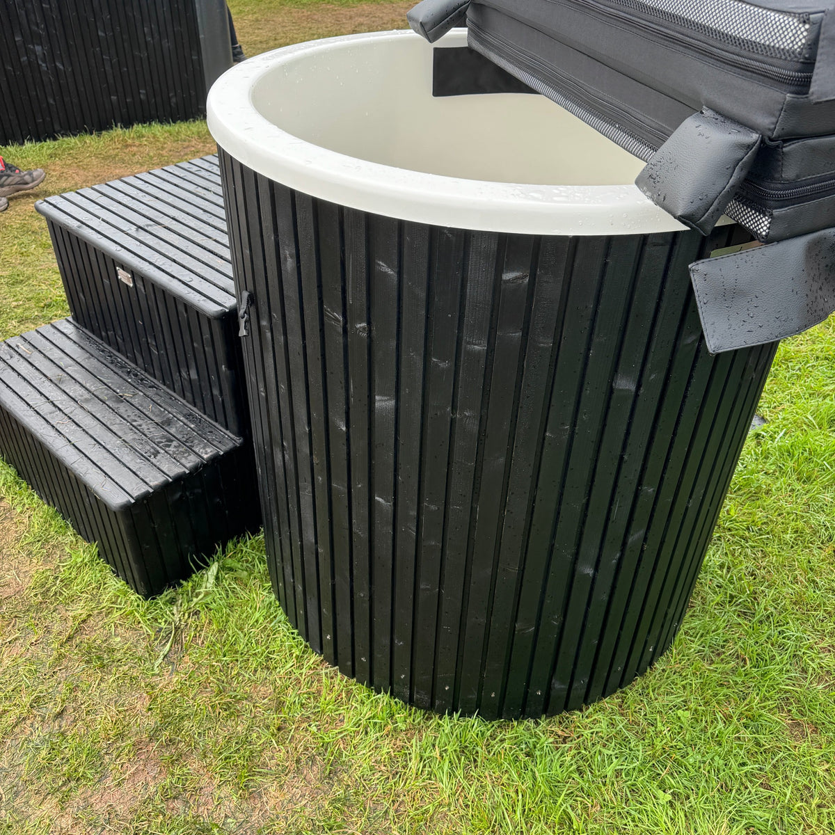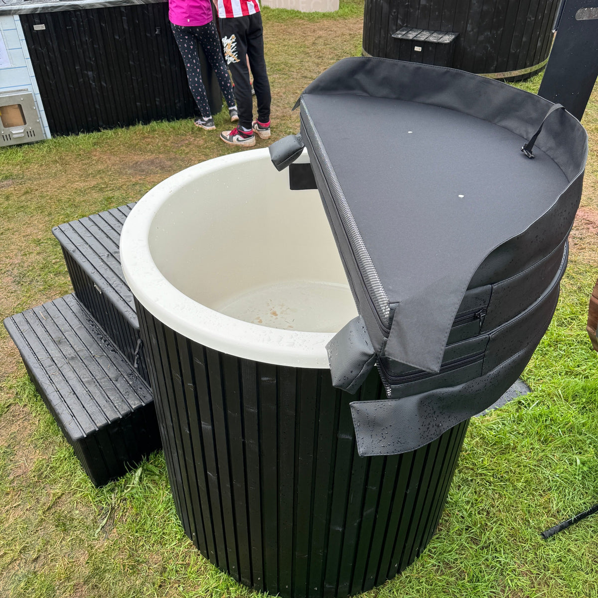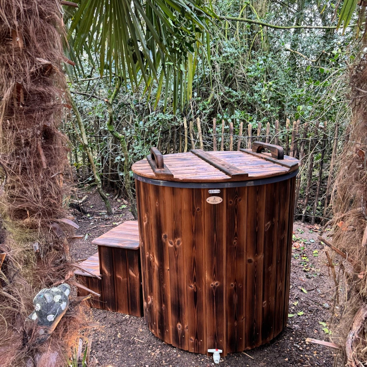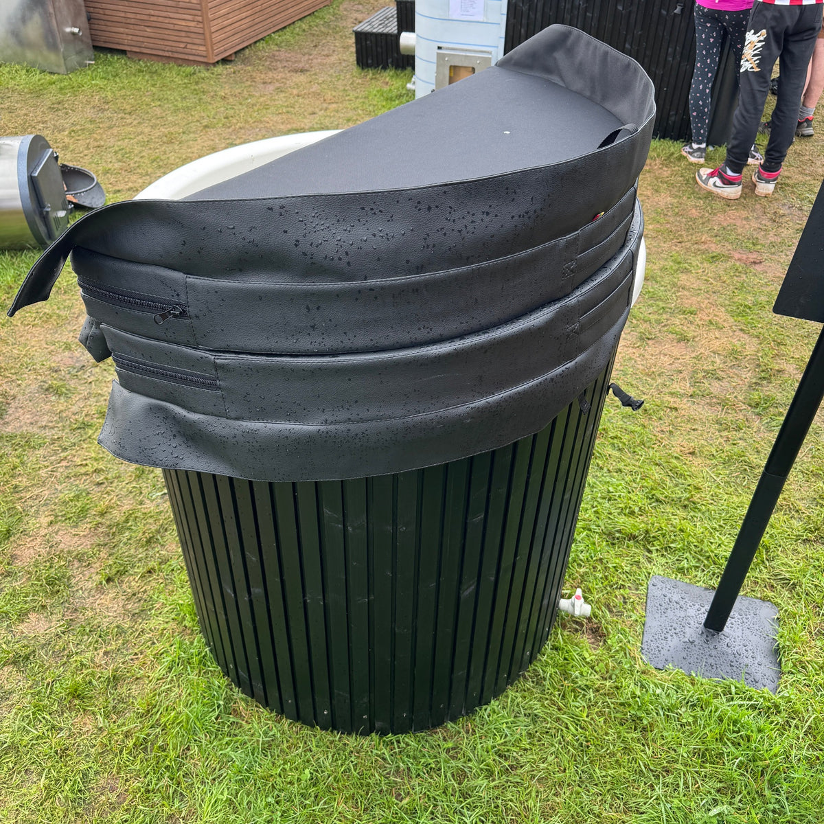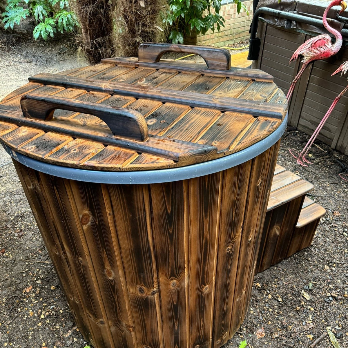 Thermowood clad with a fiberglass liner and drain tap, this is a very simple but top quality ice bath, standard configuration is with round, black folding insulated lid, please stipulate if a different lid is preferred.