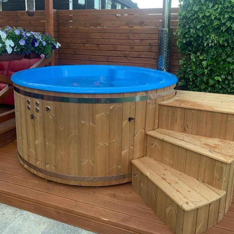 The "René" XL- 225cm 4-10 person Scandinavian Spruce, Thermowood or Composite clad, wood fired hot tub with external heater, optional spa systems and other customisable extras.
