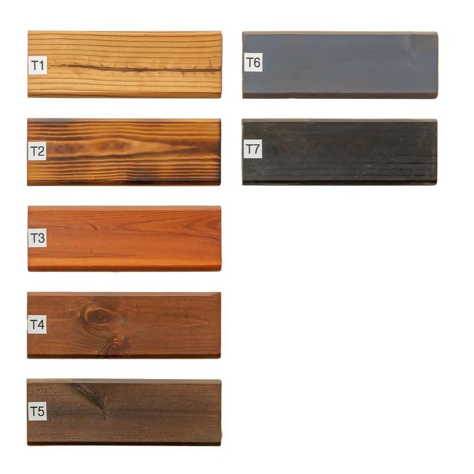Our wood-fired tubs are available in Scandinavian spruce, thermowood (oven baked spruce which is more durable but slightly more expensive) or wood plastic composite (WPC) which looks like timber but needs no maintenance, T colours are for thermowood, spruce colours are just numbered with no T.