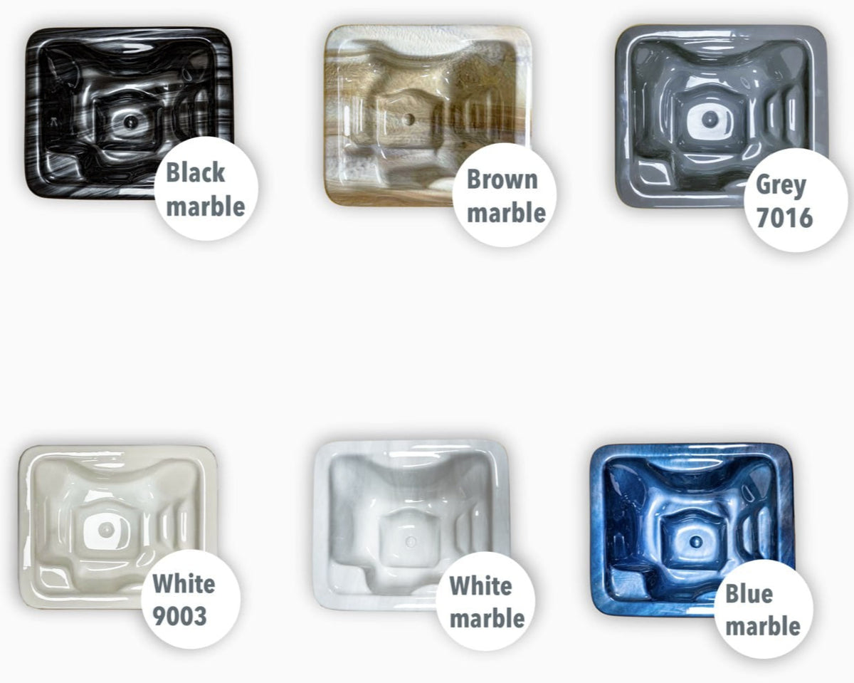 • Acrylic liner, (5 seats plus 'hot bed'), various colours available with standard or marbled variants, selectable in the options, please enquire if unsure