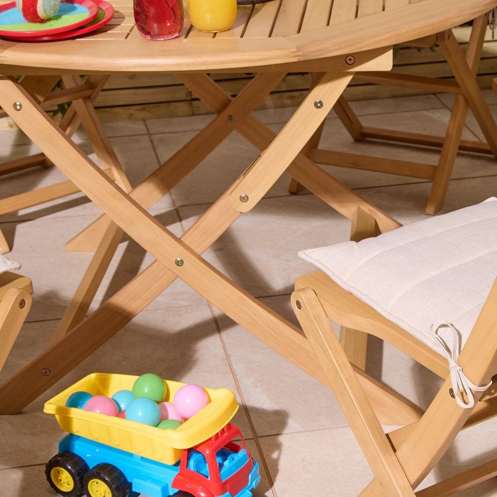 Perfect for intimate outdoor gatherings, this six-seat round dining set combines the timeless appeal of the Ashdown Range with practical design. Constructed from resilient hardwood, the collection features collapsible seating and table for straightforward storage between uses. The soft, naturally-toned cushions elevate comfort levels, allowing you to host memorable meals al fresco without compromising on style or durability.