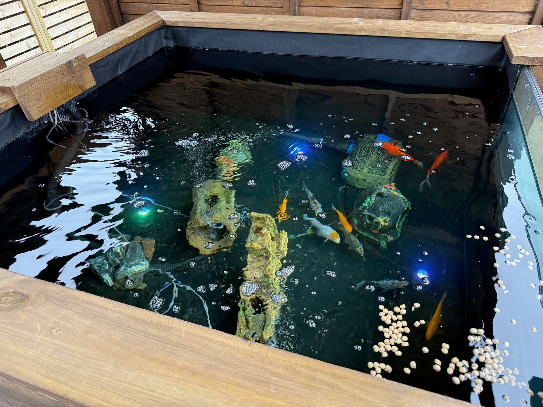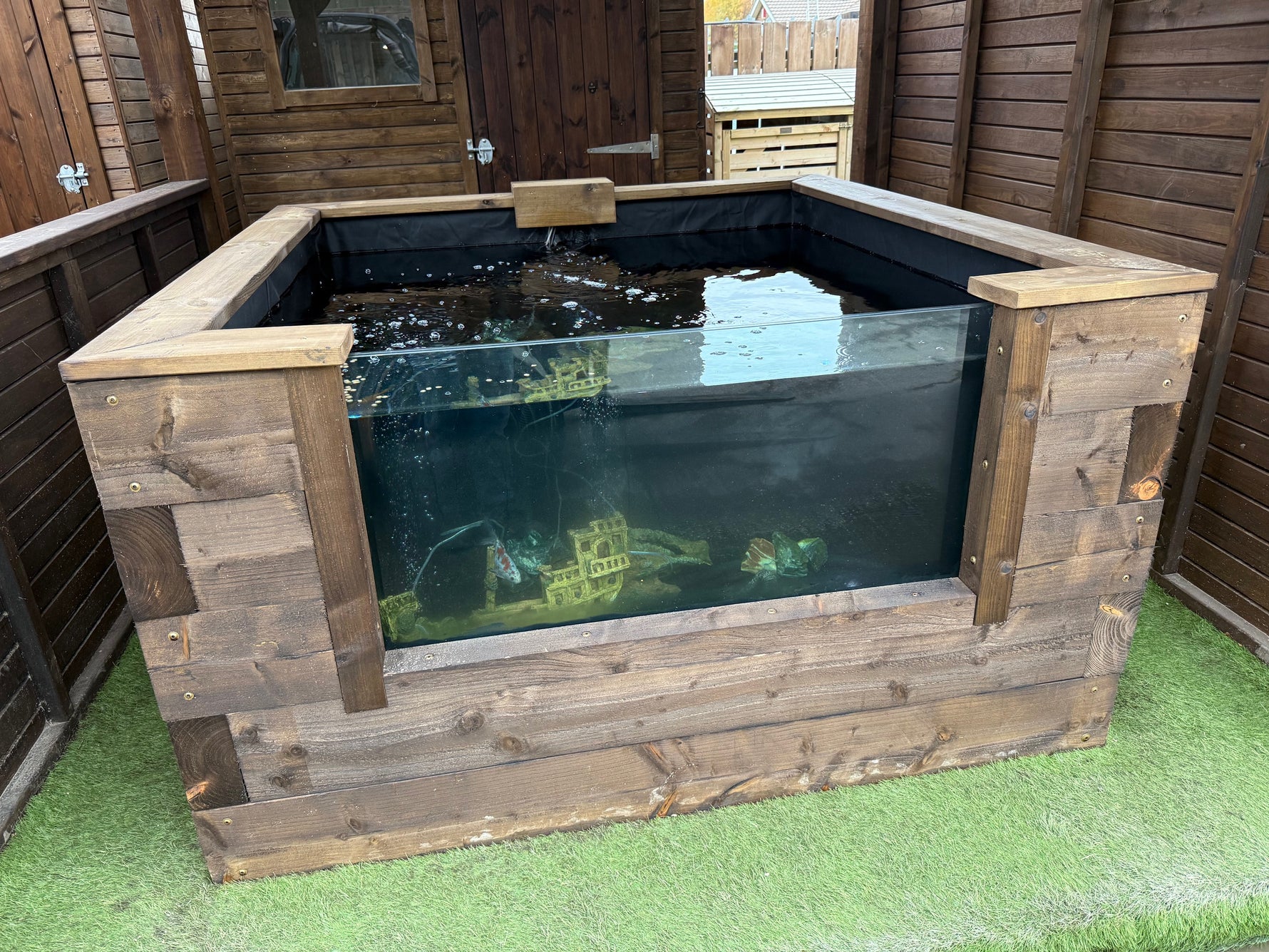 Raised, Stand-alone Wooden Koi LayzeePond® complete with viewing window, a very strong, pond with the correct depth for keeping Koi. This product is made from 200mm x 100mm sleepers on their 100mm end, we do the same and larger in our range made with the sleepers on their 200mm side if you are looking for larger. Various and any sizes are available please just ask.